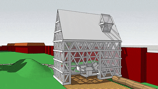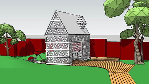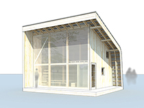 Проект трансформируемого дома для Архфермы. Быстровозводимое каркасное здание, предназначенное для временного пребывания группы до 18 человек. Ориентация поликарбонатного фасада на южную сторону позволяет повысить энергоэффективность в зимний период.
