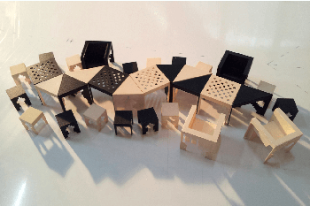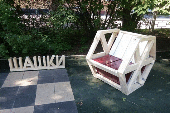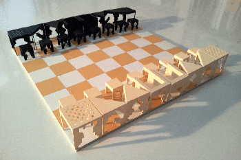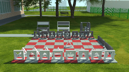 Проект для детского пансионата "Родник" в Клинском районе Подмосковья. Фигуры в виде столов, стульев и табуреток по мере приближения к эндшпилю снимаются с доски и образуют один большой стол.