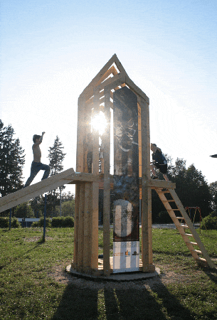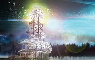 Конкурсный проект бельведера для Архстояния. «Пройдя через колоннаду стального дождя, посетитель Газебо (см. бельведер) попадает в пространство атриума, откуда широкий пандус вокруг тумана многофункциональной зоны приводит его в кучевое выставочное облако из сборных элементов. Мимо слоистых навесов над лестничным маршем, уровнем выше гостя ждет видовая терраса под лентикулярным параболоидом. Далее он попадает на главную смотровую площадку, откуда лестница из протуберанцев ведет его в самое сердце звезды. В центре светила посетитель обнаруживает кнопку запуска, и пройденный им путь озаряется вспышками электрических разрядов и вся модульная деревянная конструкция на болтовых соединениях, обработанная антисептическими растворами, сотрясается от раскатов грома»